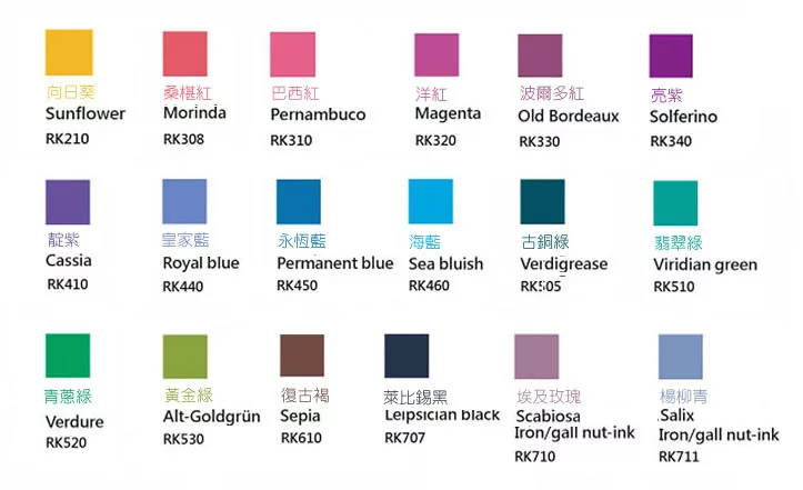 容量 50 ml,共有 18 種高彩度墨色,含兩款檔案保存專用防水墨水(710 埃及玫瑰 和 711 楊柳青)。